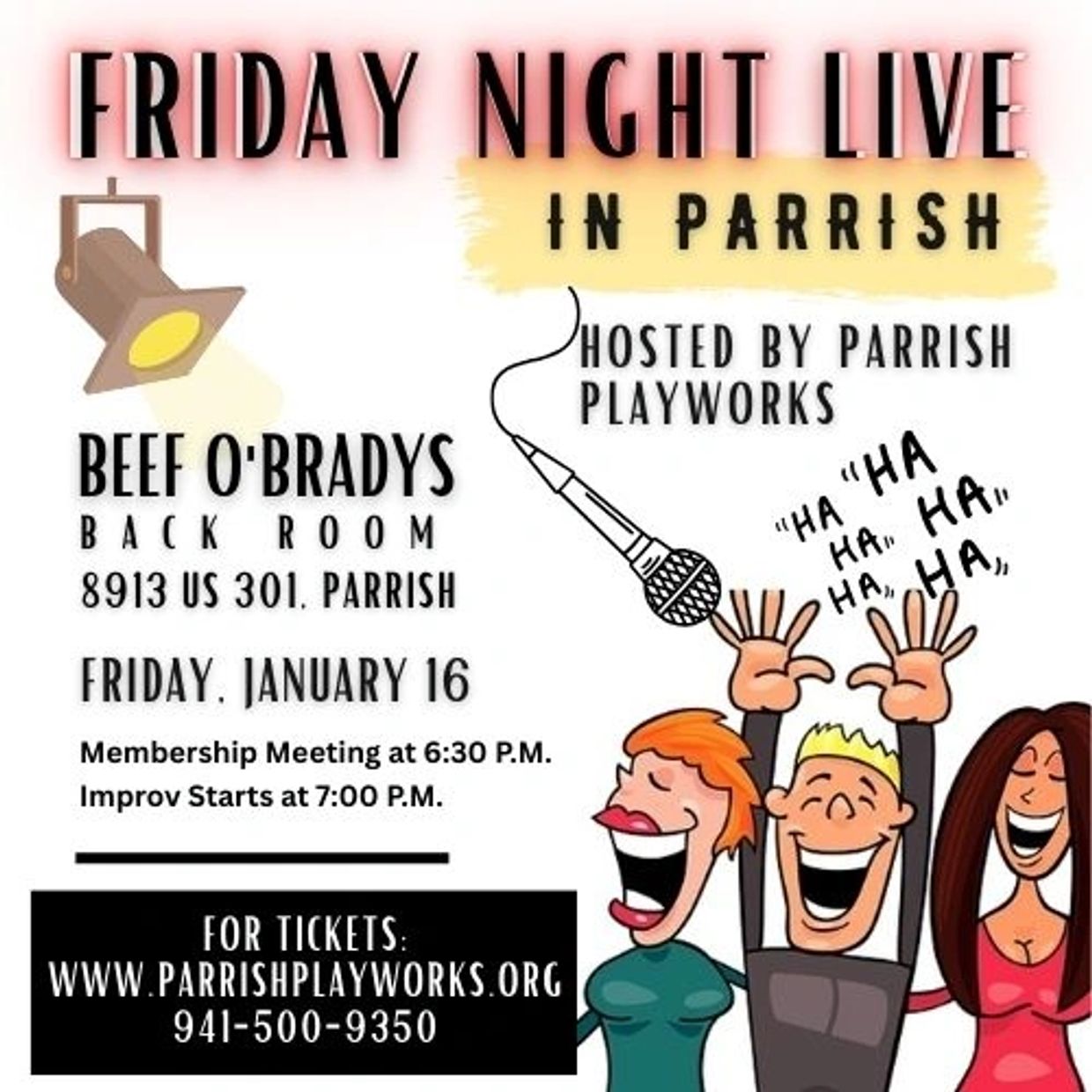 Next up is IMPROV Night at Beef O'Brady's in Parrish. It's happening this FRIDAY NIGHT! Check out our flyer above for details. $10 donation at the door is suggested. Join us on stage to play improv games, or just laugh at your friends who do that!